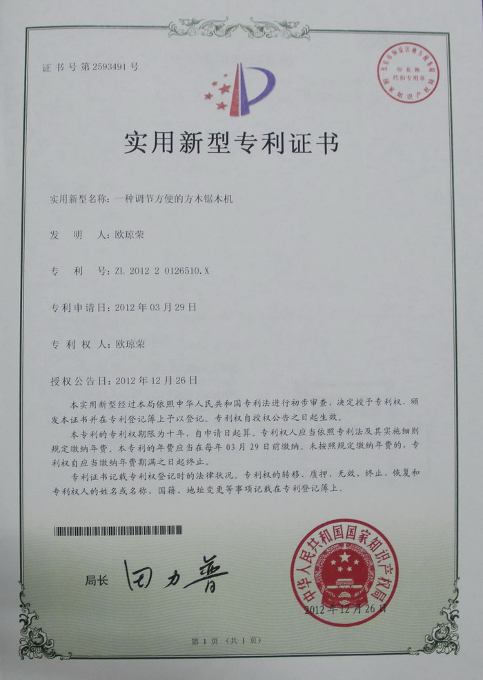 方木多片鋸----- 國家頒發機械專利證書